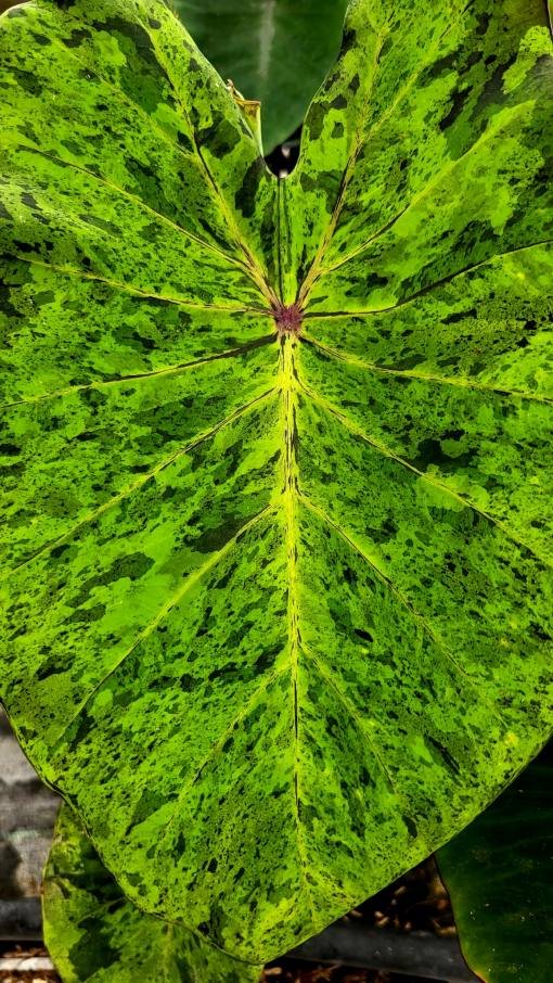 Cette Colocasia tropicale est excellente comme plante spécimen dans les bordures ou grands conteneurs grâce à son feuillage spectaculaire panaché.