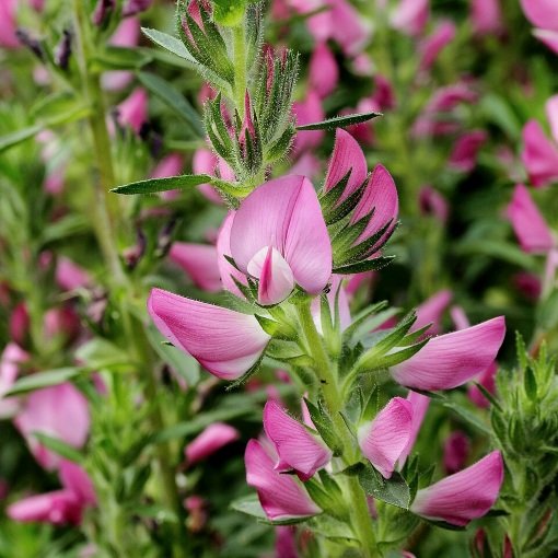 Vivace de plein soleil à fleurs roses, l’Ononis spinosa est très appréciée pour sa capacité à fixer l’azote et améliorer les sols secs et sablonneux.