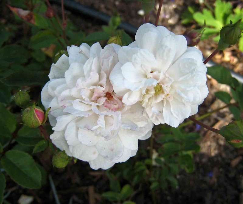 Rosa x polyantha White Fairy est rosier couvre-sol à la floraison double, blanche en bouquets denses.