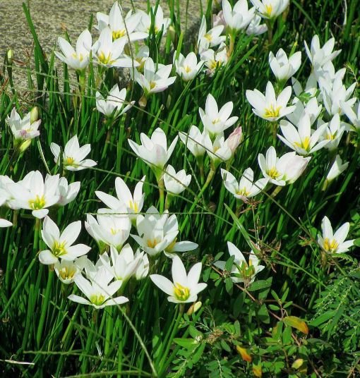 Lis de pluie bulbeux offrant une floraison blanche éclatante en fin d’été et d’automne, idéal pour les massifs et rocaille et connu pour sa tolérance à la sécheresse.